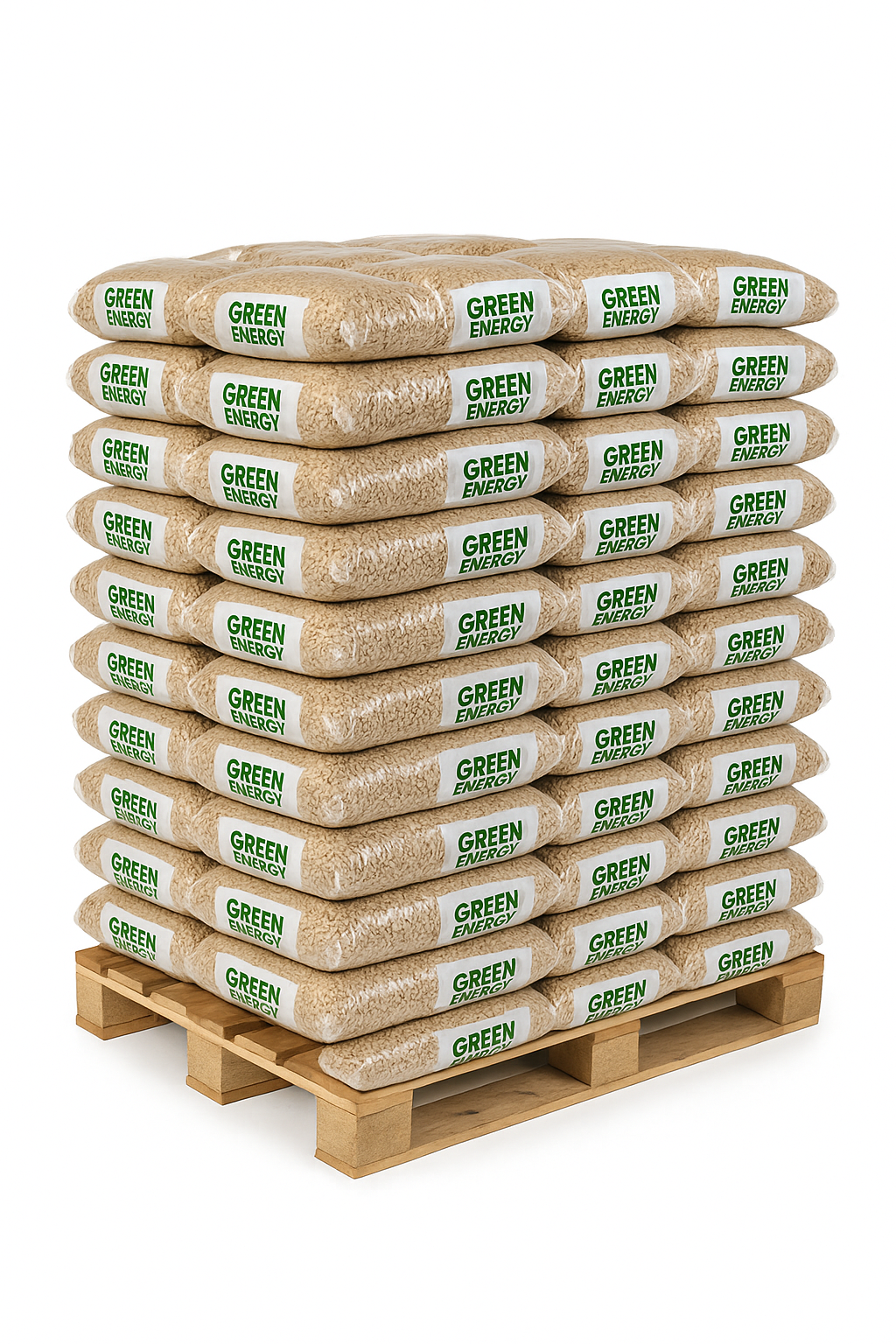 Découvrez les pellets de granulés Green Energy, conditionnés en palette de 65 sacs de 15 kg, soit 975 kg de granulés Premium. Fabriqués à partir de bois 100 % naturel, ces pellets certifiés ENplus A1 offrent une combustion propre et régulière, un haut rendement calorifique et un faible taux de cendres, idéals pour vos poêles et chaudières à pellets.